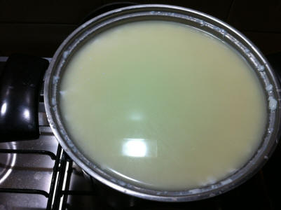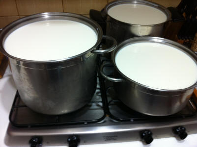 Preparate l'occorrente per fare il formaggio, indicativamente 3 litri di latte crudo, caglio, preparato con muffa del giorno prima e sale per la salatura. Questo per una forma piccola. Fate intiepidire il latte, metteteci il composto preparato il giorno prima e infine il caglio.