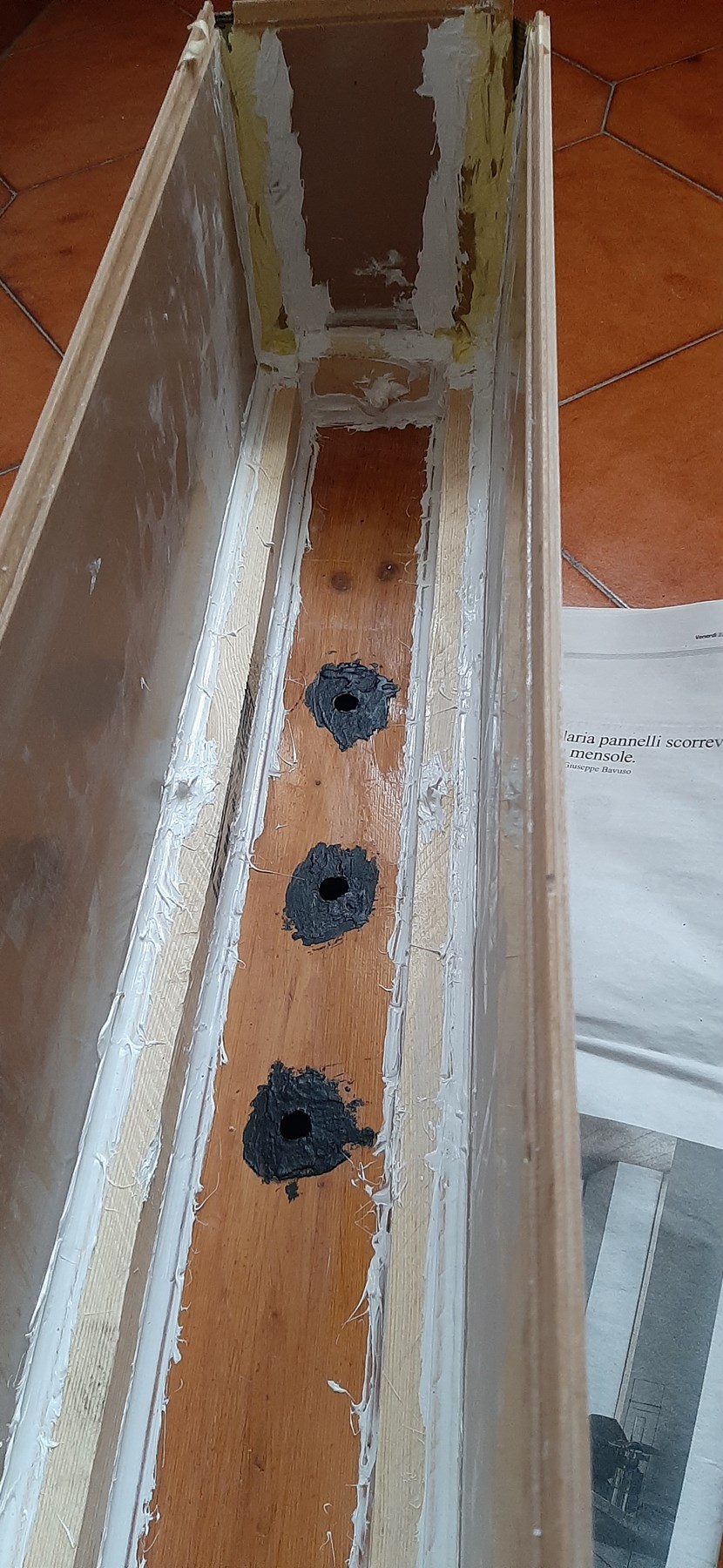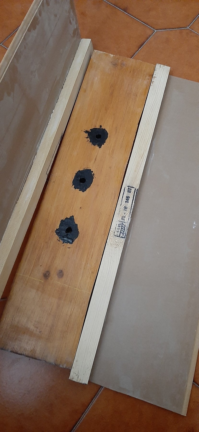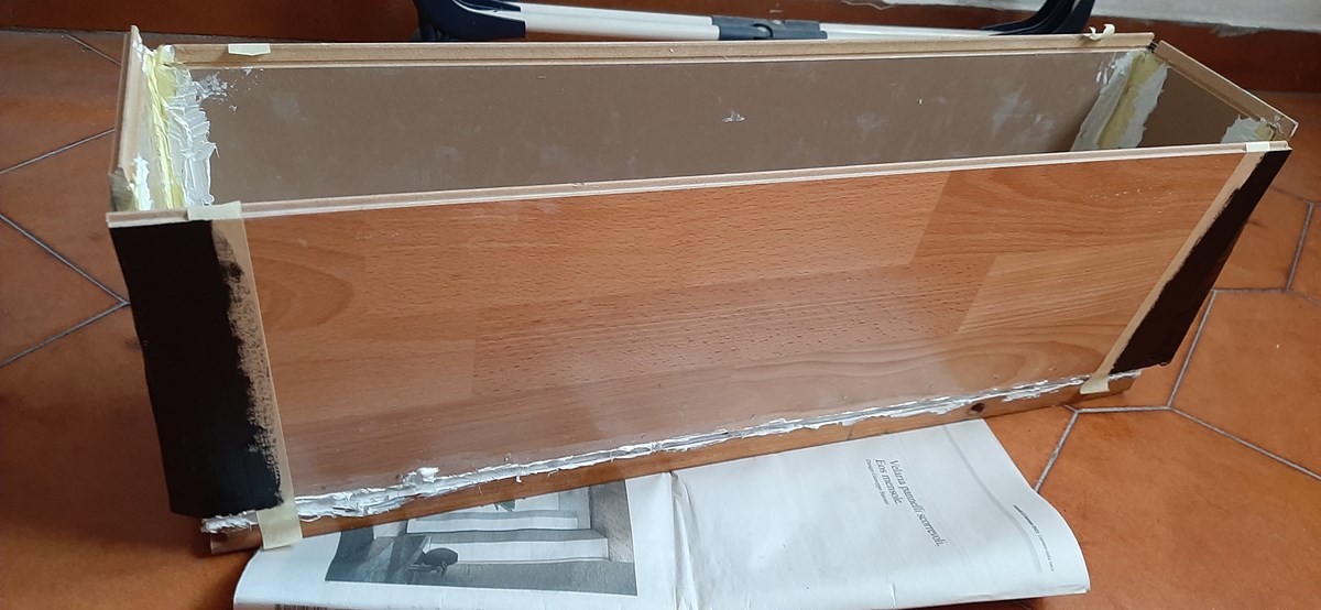 Ho realizzato la base con una mensola e due listelli per pavimento per i lati, ho fatto dei buchi sul fondo e trattati con catrame. Il legno a sua volta è stato trattato con flatting e con colla americana per esterni e chiodi.