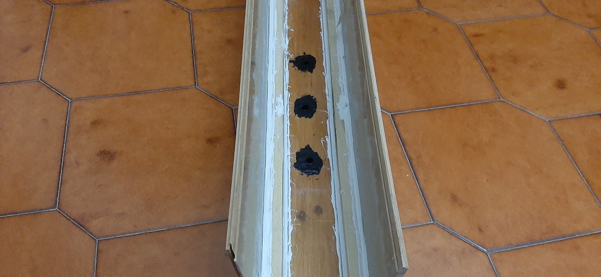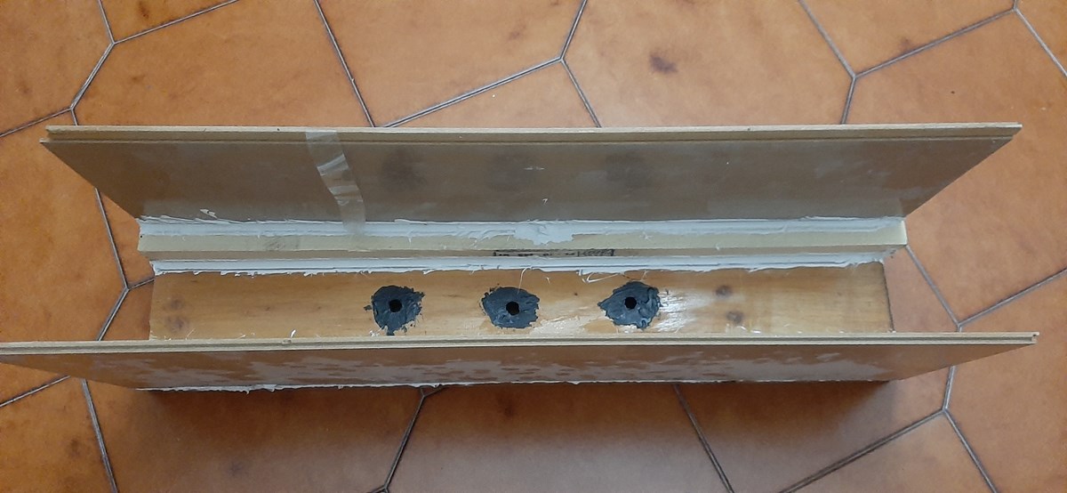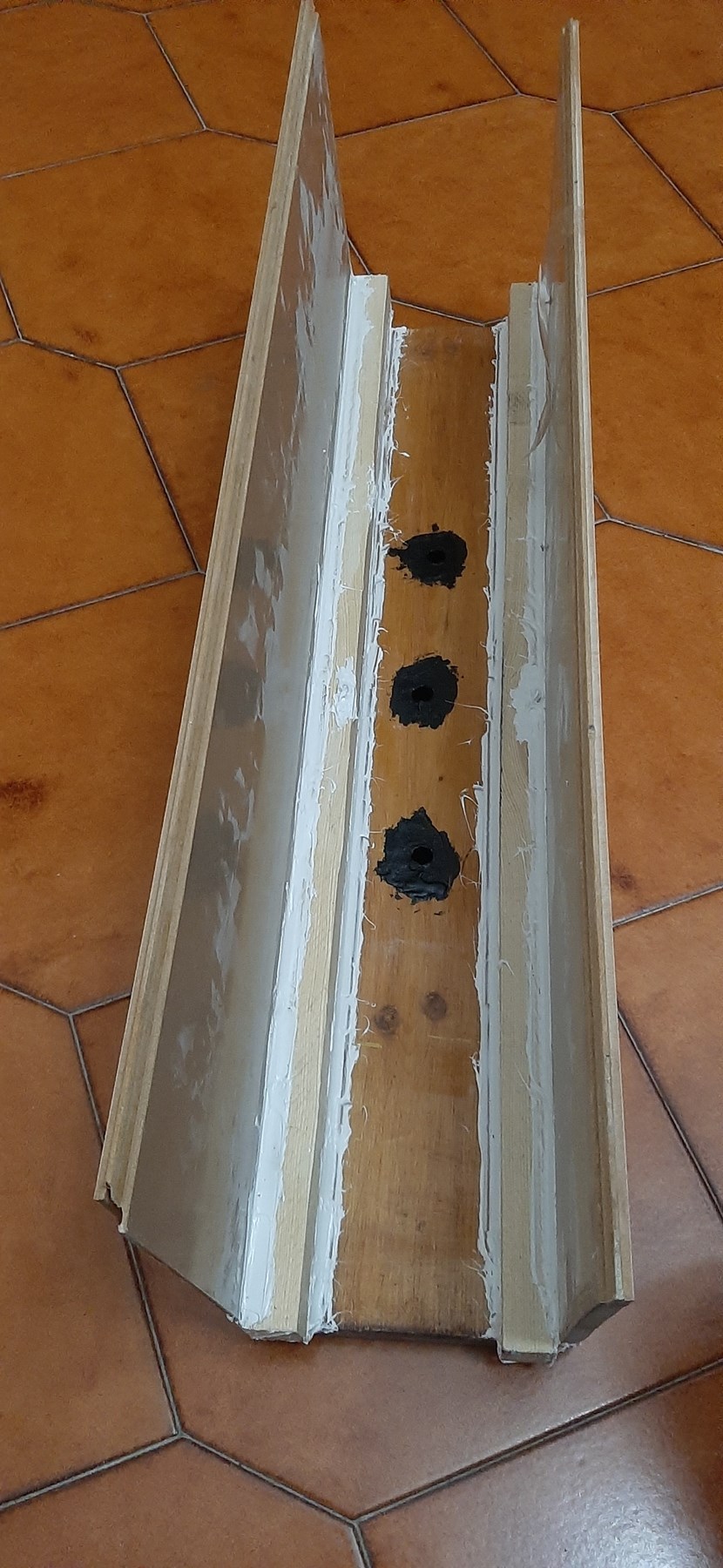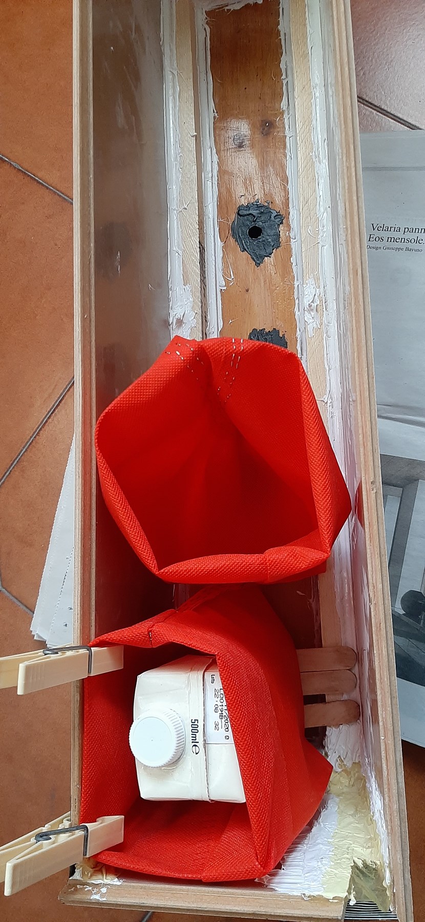 Ho realizzato la base con una mensola e due listelli per pavimento per i lati, ho fatto dei buchi sul fondo e trattati con catrame. Il legno a sua volta è stato trattato con flatting e con colla americana per esterni e chiodi.