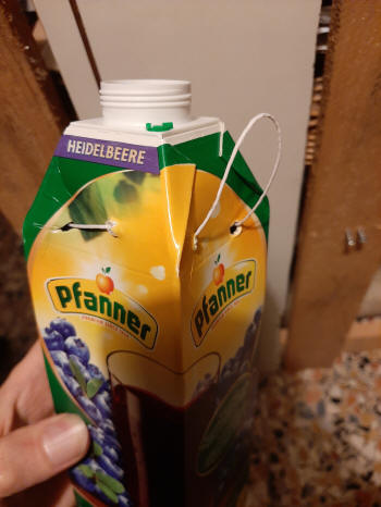 La corda viene fatta passare negli angoli, in totale 8 buchi. Qui si vede un vaso da 1l singolo e uno da 2l sempre singolo