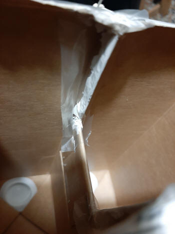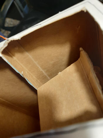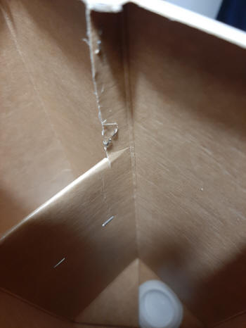 Si fa il buco sul fondo, poi si tagliano i due lati adiacenti e si abbassano da una parte. Si graffettano, così come i bordi che ho lasciato volutamente senza tagliare a filo. Successivamente si mette un po' di colla vinilica o specifica per esterni (resistente all'acqua tipo Colla Americana per esterni) nella parte tagliata, eventualmente si può coprire con della plastica di un sacchetto o confezione di cibo. in ogni caso anche se perde qualche goccia andrò a finire nel sotto vaso o nel vaso sottostante se impilata.