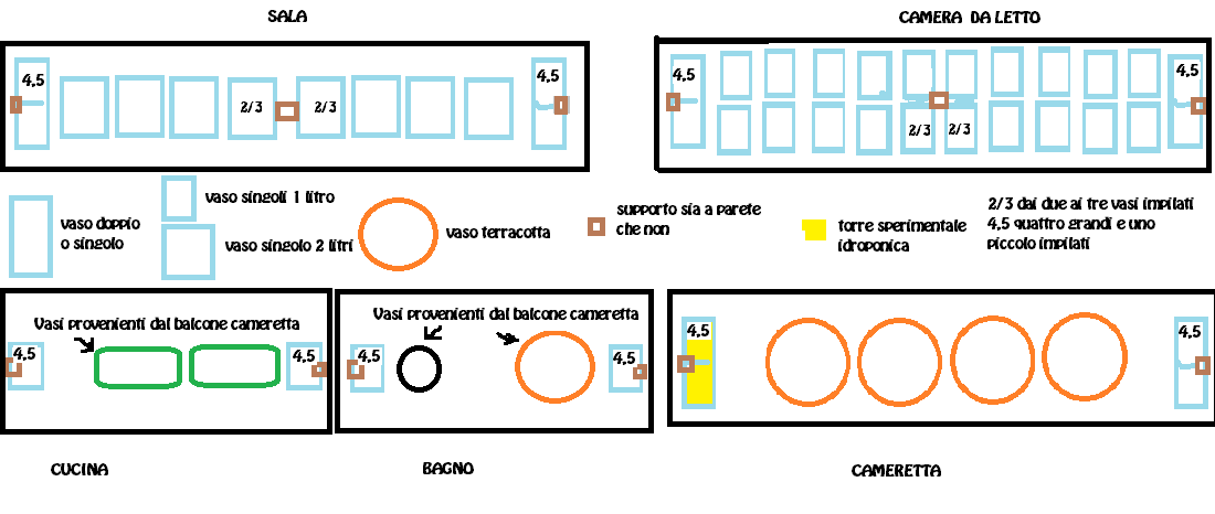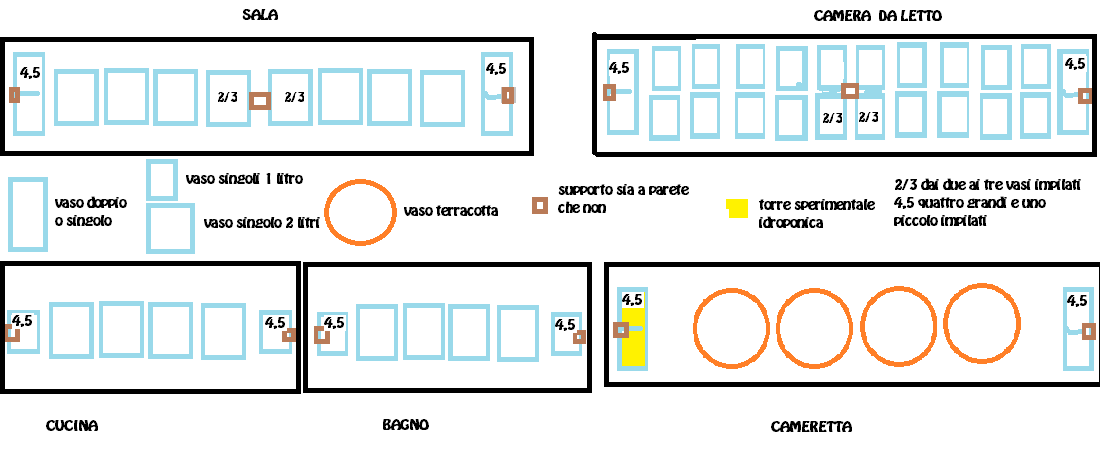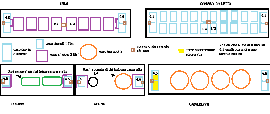Ho colorato di viola i vasi da due litri. In sala nella parte centrale ci stanno solo quelli (o uno singolo da 1 litro e non du da due litri), mentre in basso nelle colonne laterali il primo può essere uno da due litri singolo o da un litro e quelli successivi possono essere 2 da un litro per via del tipo di zanzariera. Nelle due piccole in bagno e cucina di lato ci possono stare sia quelli da 1l che quelli da 2l singoli.