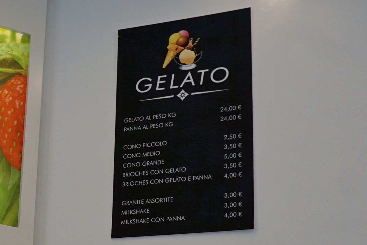 PREZZI: il gelato costa 24,00€ al kg, una coppetta piccola 2,50€,