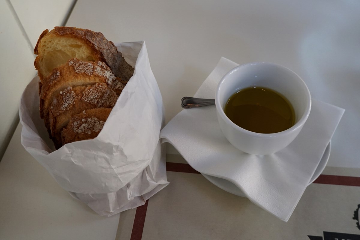 bottiglia d'acqua potabile. Viene portato del pane di Altamura con olio.