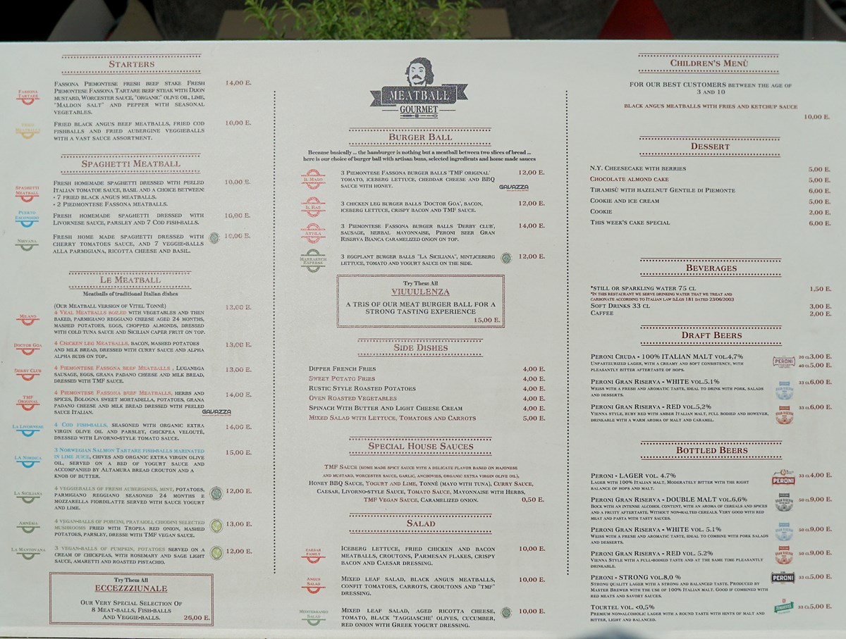 una selezione di 8 polpette si paga 26,00€. Ci sono anche spaghetti con