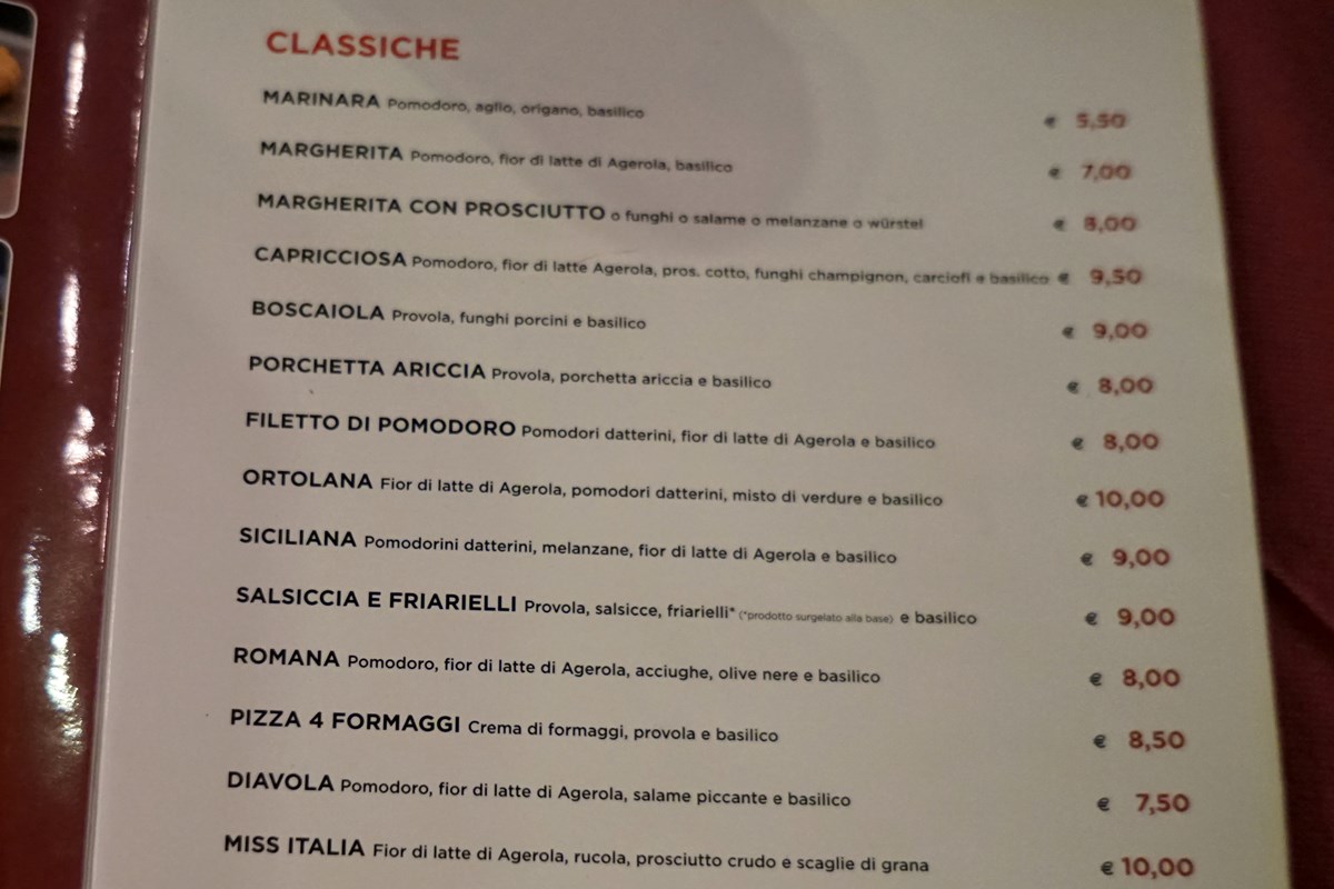 PREZZI: le pizze classiche vanno dai 5,50€ della marinara, ai 7,00€