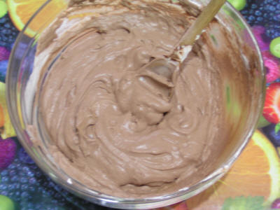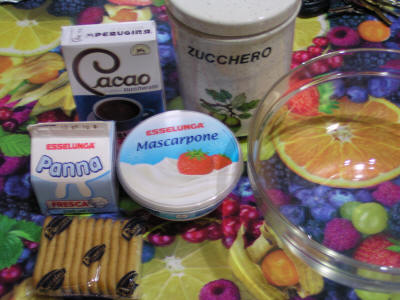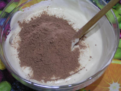 Iniziare mescolando tutto lo zucchero con il mascarpone, poi montare la panna e incorporarla, infine aggiungere il cacao e mescolare bene