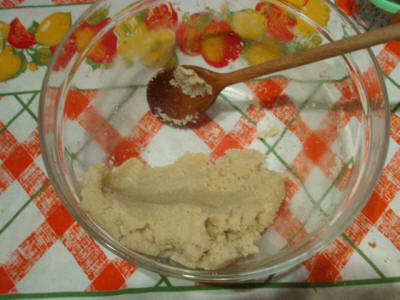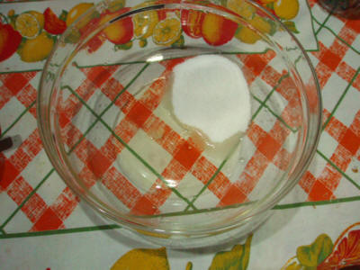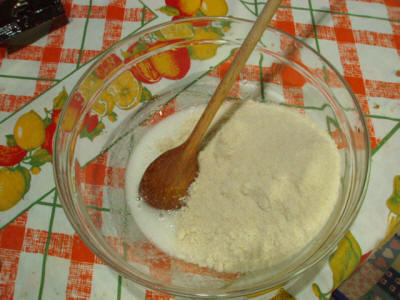 Separare il tuorlo dall'albume. Unire lo zucchero all'albume fare sciogliere lo zucchero, poi la pasta di mandorle e mescolare bene per unire gli ingredienti