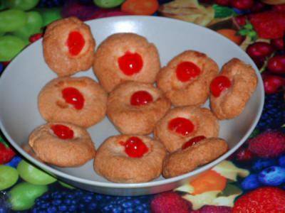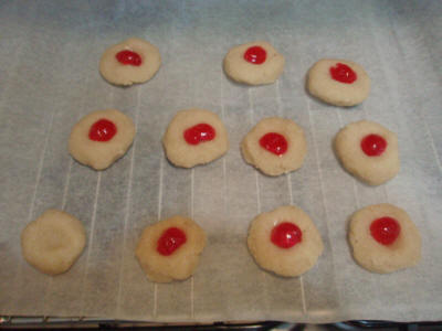 Fare delle palline con le mani comprimendo il composto, metterlo poi sulla carta da forno e una fare una piccola rientranza con il dito e posizionate sopra metà ciliegia candita
