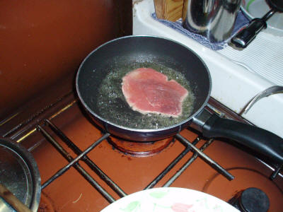 Mettere un ricciolo di burro e un goccio d'olio, far scaldare e quando si è sciolto mettere a cuocere la bistecca