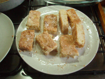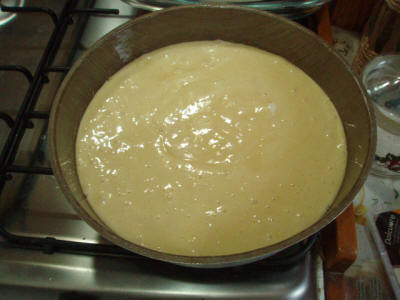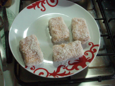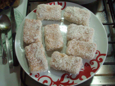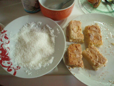 Mentre cuoce preparate la bagna con latte di cocco aggiustando di dolcezza con il latte condensato. Una volta cotta tagliatela a rettangoli e bagnateli bene, poi passateli nella farina di cocco