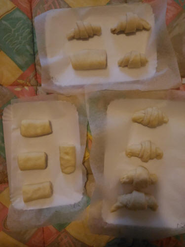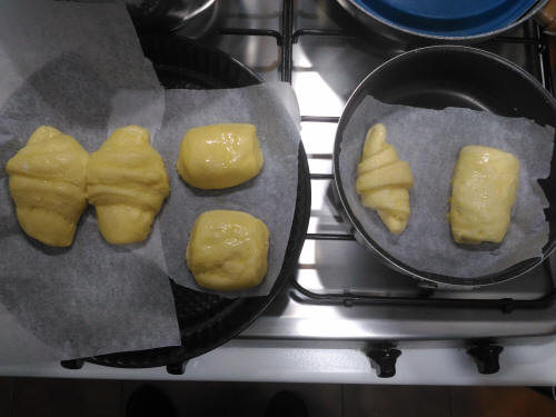 Una volta fatte le forme ho lasciato lievitare per 2-3 ore. A sinistra: in alto i croissant, in basso le danesi. Le danesi più idratate hanno lievitato meglio.