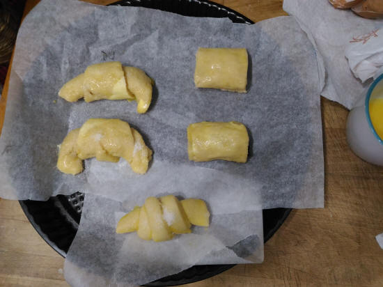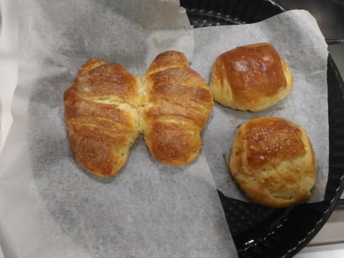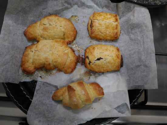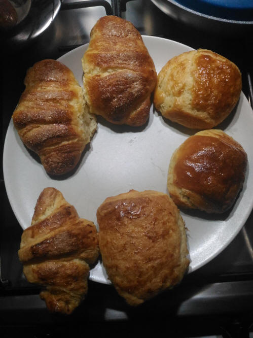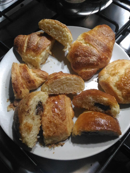 Entrambi poco dolci, abbastanza (molto) burrosi. Dei due è meglio la croissant perché è più fragrante. Potrei provare ad aumentare lo zucchero. Nell'angolo a sinistra (i croissant) a forma di cornetto e di pane al cioccolato, intorno le danesi.