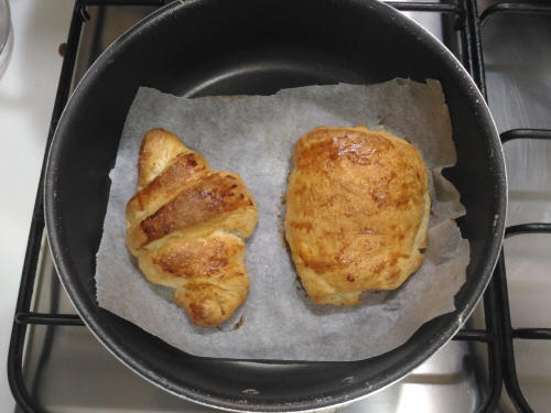 Cotti a 180° per 20 minuti. Le danesi (a sinistra) hanno fatto fuoriuscire il burro, i crossant (a destra) no.