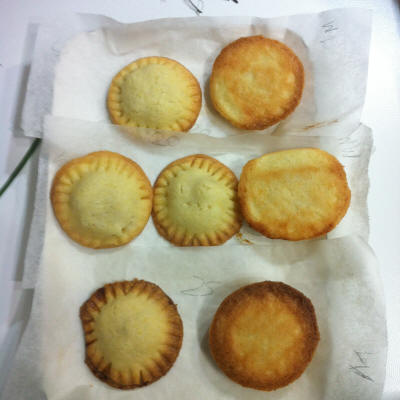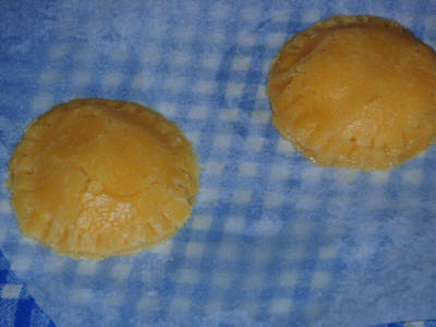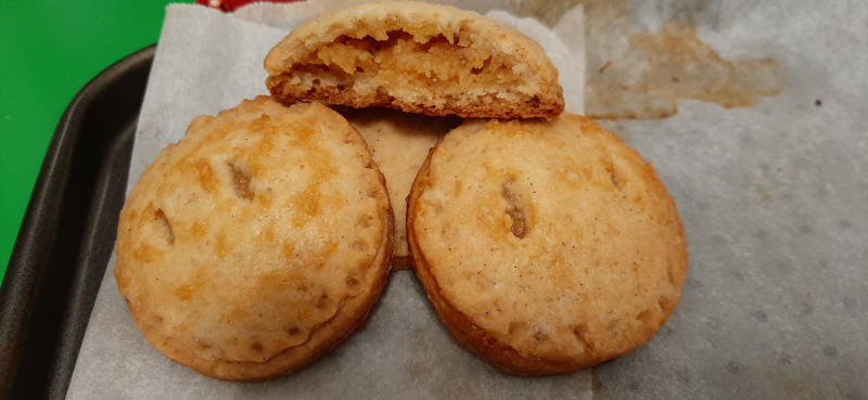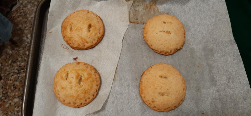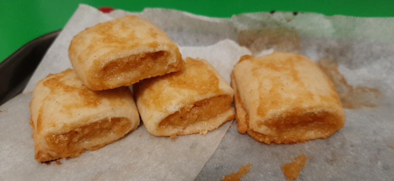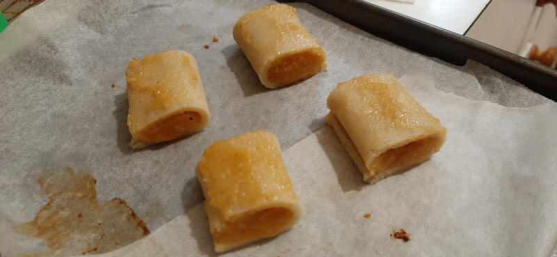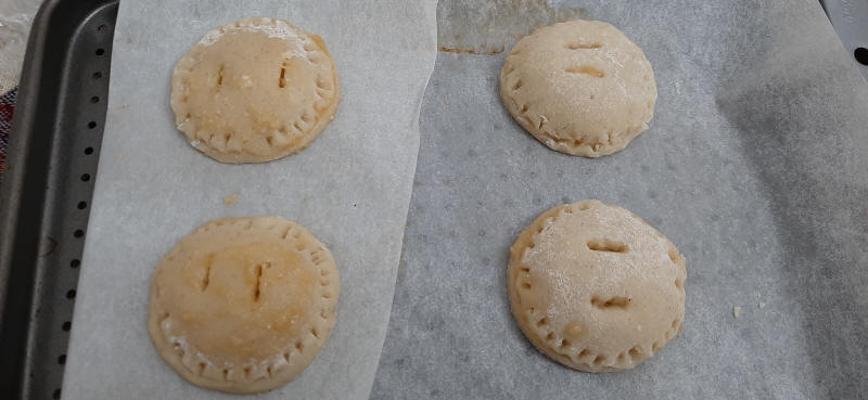 | Esperimento 2021 Ho provato a utilizzare l'impasto con lievito con 50g di farina e all'interno 15g di purea di mele e banane, 15g di confettura di albicocche, 5g di farina di mandorle. Ho fatto due versioni, una tona chiusa a raviolo e una seconda simil settembrini. Nella seconda versione a settembrini è uscito il ripieno che essendo non troppo denso non è rimasto dentro, la soluzione potrebbe essere cuocere leggermente il ripieno prima di farcire, dato che ho notato che una volta cotto il ripieno si è addensato. Ad alcuni ho provato a spalmare un po' di ripeino sopra per vedere come veniva in cottura Vecchia ricetta Fate una pasta frolla e formate dei dischetti di dimensioni uguali Poi cuocete la mela con un pochino di zucchero e cannella