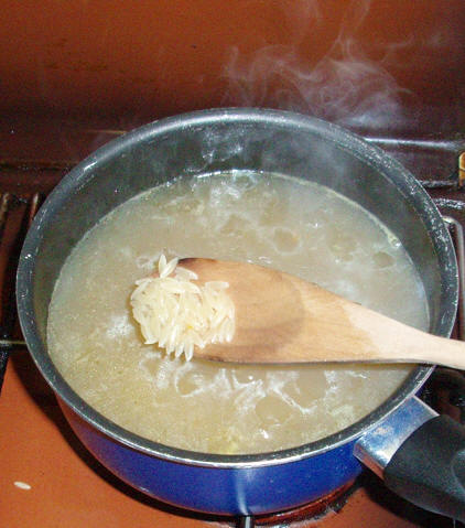 Mettere il brodo in una pentola di piccole/medie dimensioni, se avete quello di carne o vegetale preparato da voi è meglio se no potete farlo con il dado, portatelo ad ebollizione e mettete 3 pugni di risoni
