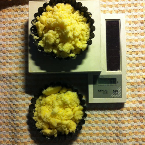 Ho ridotto il burro al 60% e ho fatto due versioni: una con 1/2 tsp di acqua e uno con 2 x 1/2 tsp di acqua. A sinistra con il doppio dell'acqua, a destra con 1 solo 1/2tsp