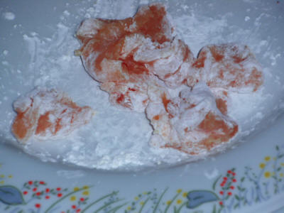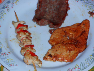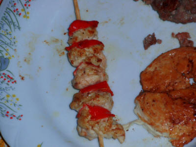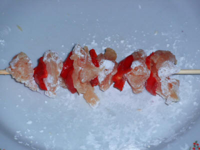 Si prendono i petti di polli e si tagliano a pezzettini e si rotolano leggermente nella farina, poi si tagliano i peperoni a pezzi abbastanza grandi e si infilano sullo spiedino alternati