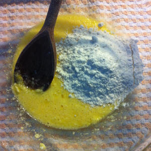 Prima mettiamo le uova e lo zucchero mescoliamo il tutto ottenendo una crema abbastanza liquida