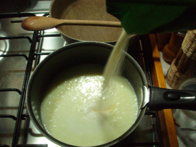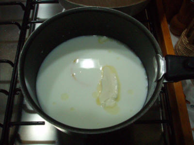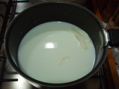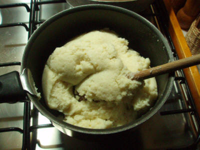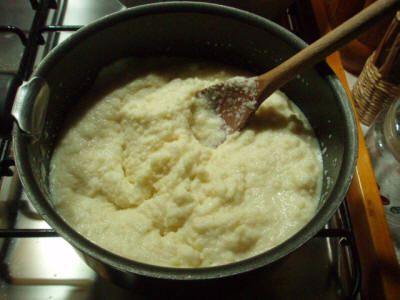 Mettete l'acqua, il latte, il burro una scorza di limone sul fuoco quando bolle abbassate la fiamma a mettete il semolino lentamente sempre mescolando, fate cuocere per un po' finché non si trasforma in un polentino sodo, a quel punto togliete dal gas e lasciate raffreddare. Ho notato che se il liquido non è molto caldo, quasi bollente, se metto prima il semolino non si raddensa (nonostante lo cuocia di più). Quindi va messo solo quando molto calda, quando si vede sobbollire