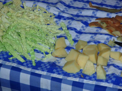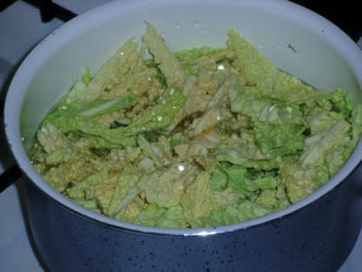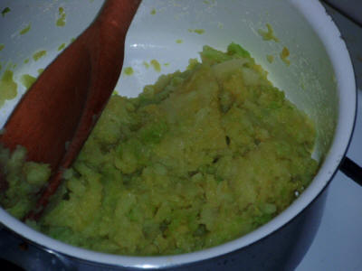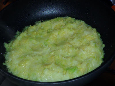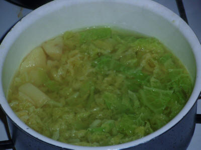 Tagliare la verza e le patate, far bollire inizialmente la verza in acqua poco salata, poi aggiungere la patata. Quando le patate sono cotte eliminare l'acqua, schiacciare le patate e mescolare il tutto.