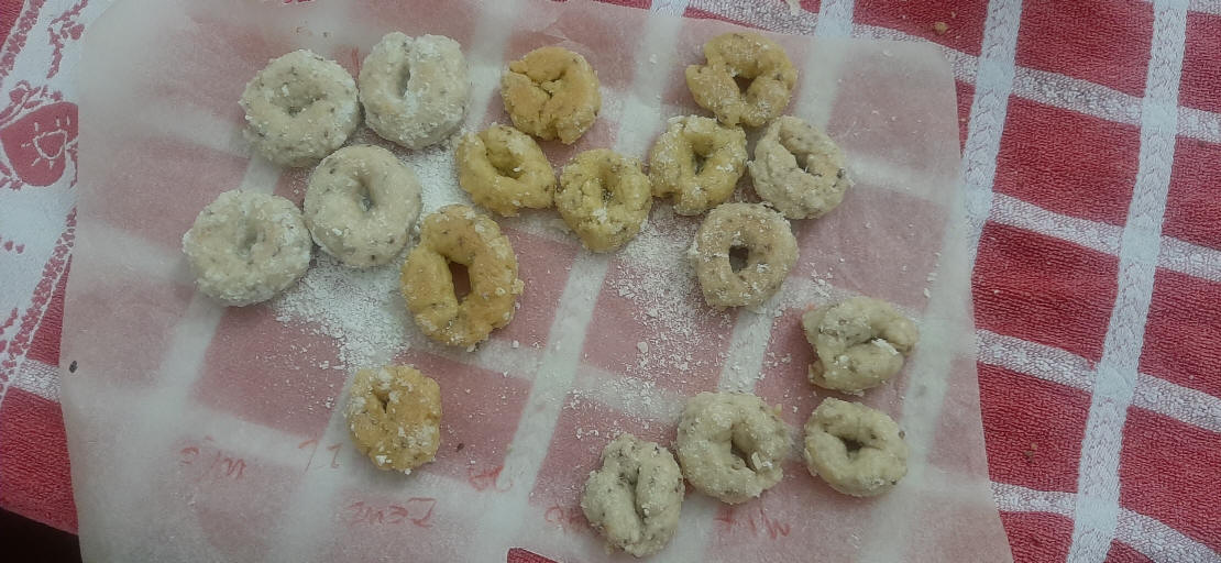 Si fanno i frollini e si cuociono per 25-30 minuti, non devono scurire troppo, si fanno a forma di tarallo con il buco in mezzo in modo da poterli infilare in una corda come una collana