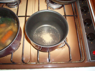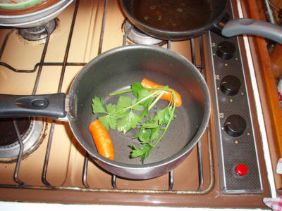 Per il brodo mettiamo acqua, sedano, carota, un pizzico di sale, una testa di aglio e qualche testa dei gamberi, lasciarlo bollire per una buona mezz'ora