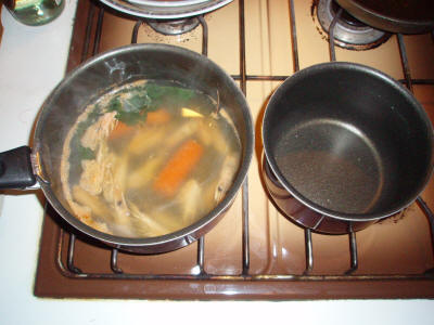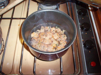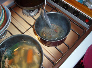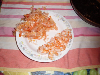 Aggiungete i gamberetti e un po' di prezzemolo tritato, assaggiate il brodo, qualora dovesse risultare troppo saporito, toglietene un po' e aggiungeteci acqua tanta quando il brodo che avete tolto, dopo poco ripetete l'operazione finché non è di vostro gradimento