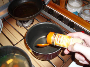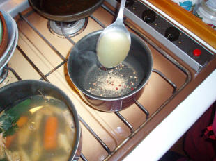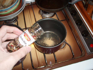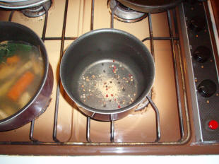 Una volta pronto il brodo mettete a fianco un'altra pentola, metteteci lo zenzero, pepe nero, rosa e bianco (va bene anche solo il pepe nero), brodo di pesce che abbiamo fatto, un goccio di salsa di soia